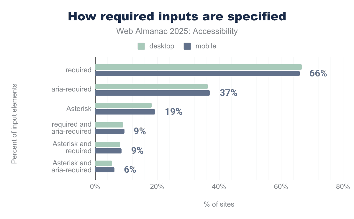 :focus selector is present on about 90% of both desktop and mobile pages, while removing focus outlines with :focus { outline: 0; } appears on roughly two-thirds of pages (67%) for both. Usage of the more accessible :focus-visible selector is much lower, at about one-quarter of pages (25% on desktop and 24% on mobile).In 2025, 67% of sites explicitly removed default focus outlines, up 14% from 2024. This concerning trend may impair accessibility if not replaced with effective styles. On the positive side, adoption of the :focus-visible pseudo-class has grown. This means developers are starting to create context-aware focus indicators that are visible only when necessary.