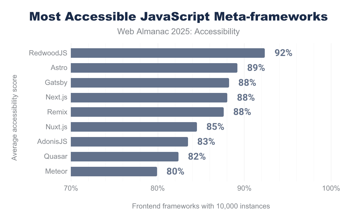 In 2025, OpenUI5 has risen in accessibility rankings, while frameworks that led in 2024 (Stimulus, Remix, and Qwik) have shifted positions. Remix appears in both UI and meta-framework categories, but has declined in rankings in 2025, allowing other frameworks to advance. This volatility may reflect sample size changes or real improvements in competing frameworks. The fact that all Remix functionality was integrated right into the next version of React Router, making Remix redundant as a React framework, can also have an impact on rankings.