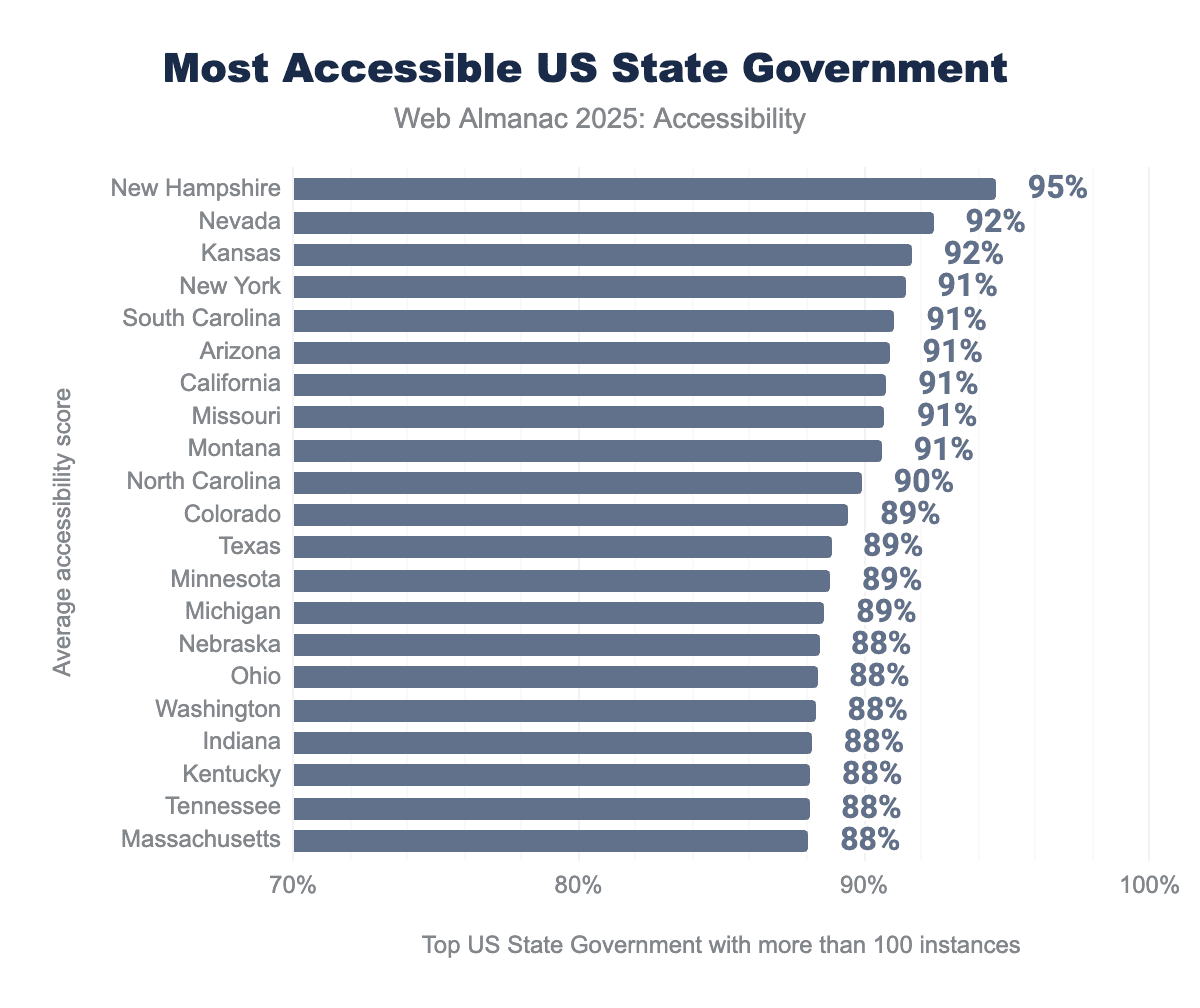 Nevada, Kansas, California, and New York did well in the samples from both years. But the averages don’t indicate that state governments made any significant progress in achieving the new requirements from the 2024 US Department of Justice Final Rule to Strengthen Web and Mobile App Access. State technology leaders at the National Association of State Chief Information Officers (NASCIO) national conference reaffirmed accessibility as a top priority.