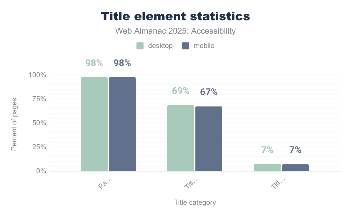 The number of sites that disable zooming or scaling continues to drop. In 2025, only 19% of mobile sites and 21% of desktop sites restrict scaling, either by using user-scalable=no or setting a restrictive maximum scale. That’s a 1–2% improvement over 2024, showing slow but steady progress.