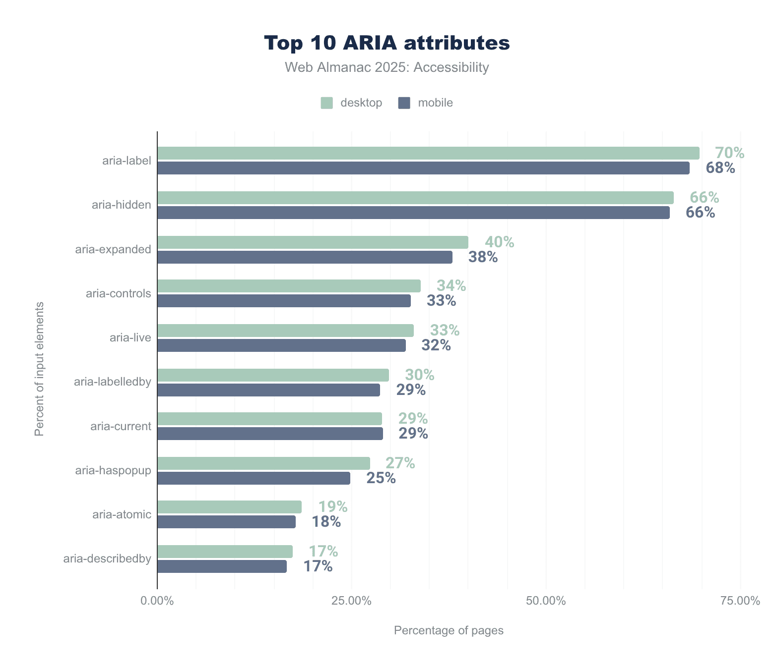 This year, text contrast pass rate improved by roughly 1% compared to 2024. But only 31% of mobile sites currently meet minimum color contrast requirements. Since mobile experiences depend heavily on clear visibility, this gap is a real problem for users accessing the web on their phones.